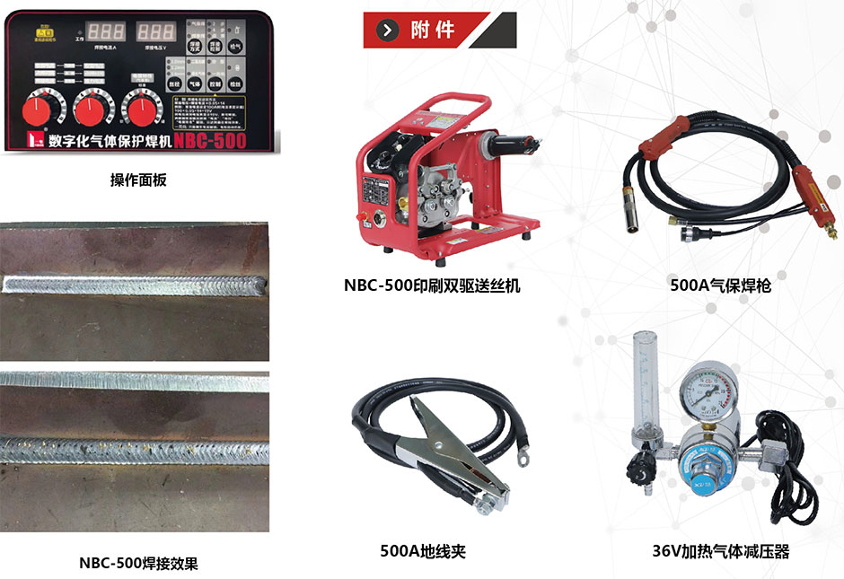 ● 气体保护焊具有:焊接电流,焊接电压分别控制功能(精准预置),一元化控制功能(只要调节焊接电流,焊接电压会自动匹配,操作简单,有利于初学者使用,操作得心应手)。